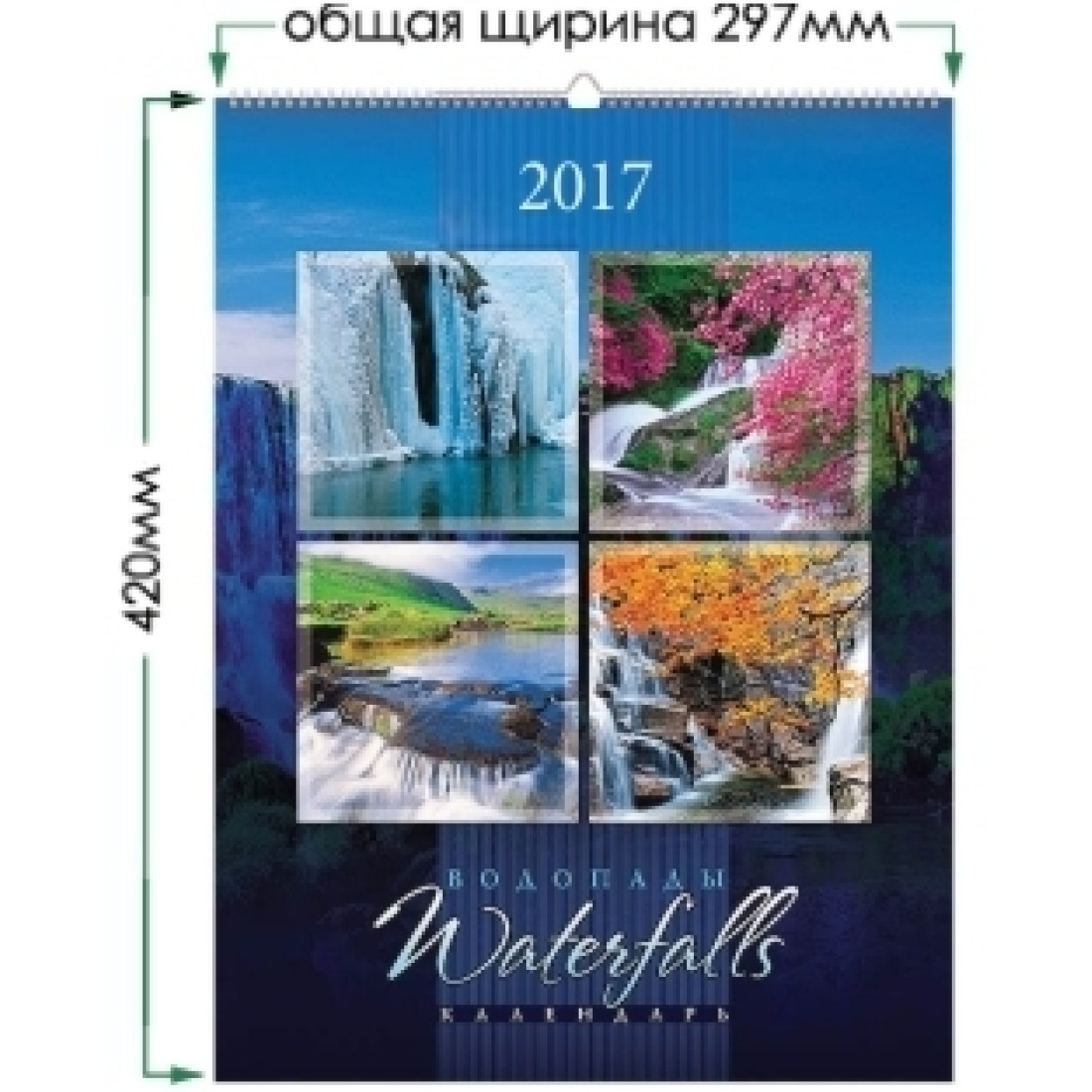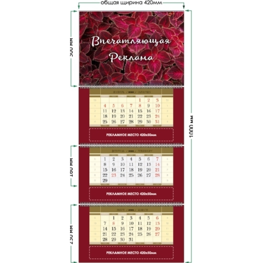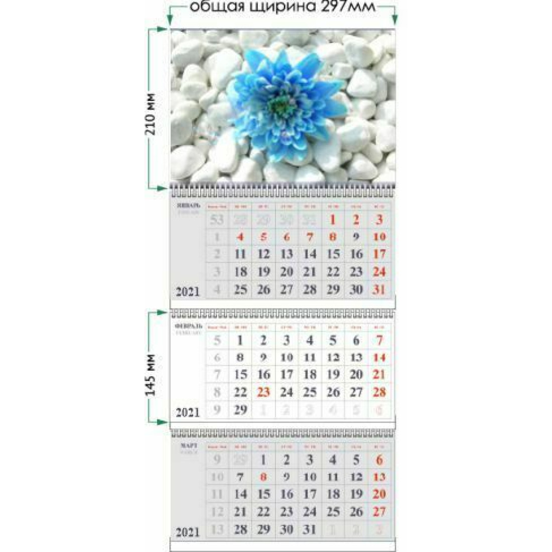 Настенные квартальные календари на 3-х «пружинах» изготавливаются с индивидуальным полноцветным топом (верхушкой) на картоне и стандартными двухцветными календарными блоками на офсетной бумаге 80 г/м2.