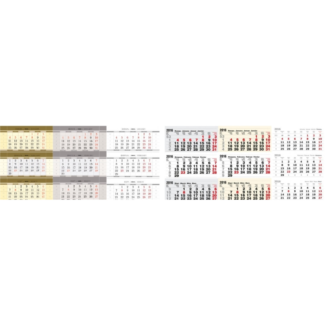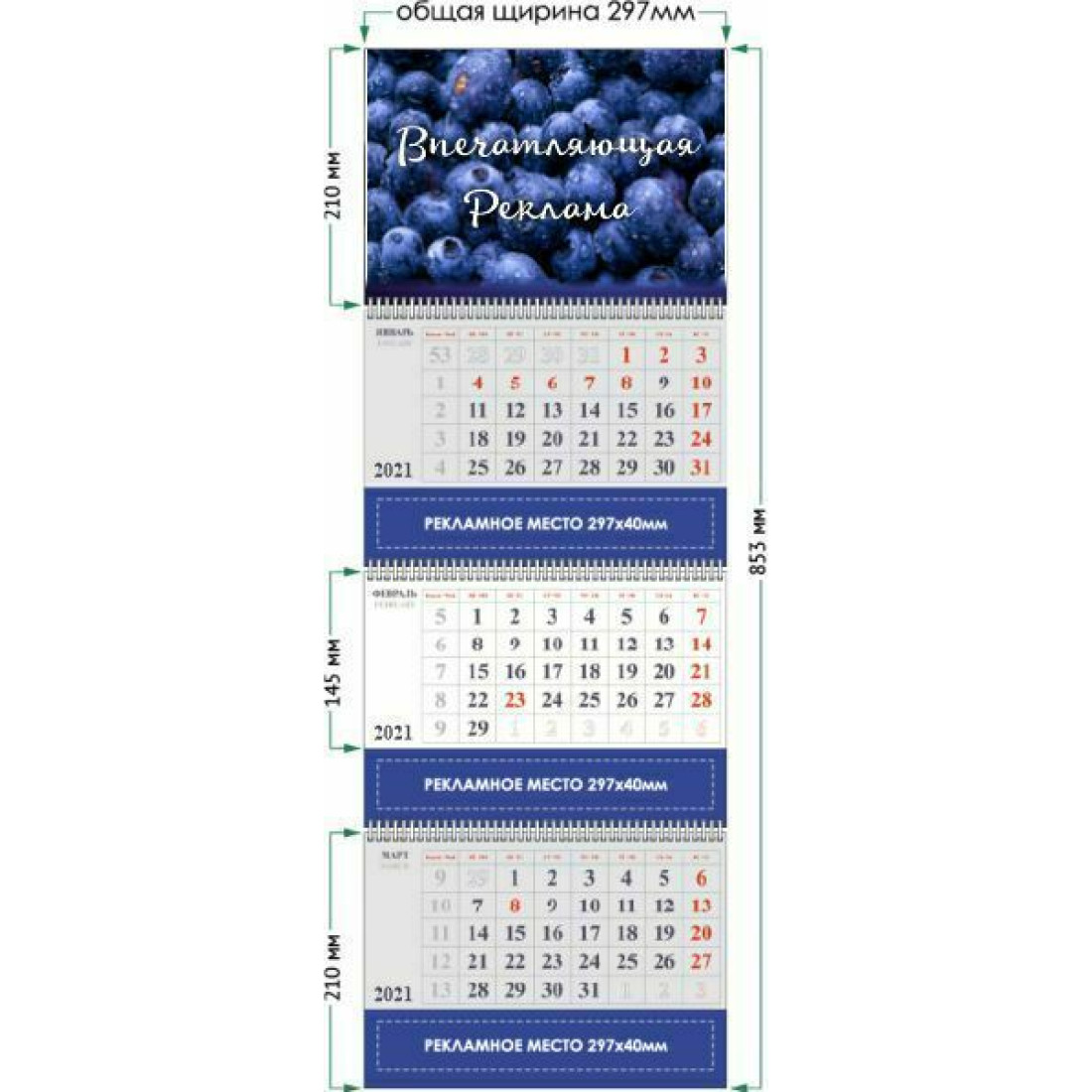 Настенные квартальные календари на 3-х «пружинах» изготавливаются с индивидуальным полноцветным топом (верхушкой) на картоне и стандартными двухцветными календарными блоками на мелованной бумаге 115 г/м2. Под календарными блоками обычно размещается рекламное поле. На календарь устанавливается кольцо для подвешивания (пикколо) и курсор. По желанию клиента топ ламинируется.