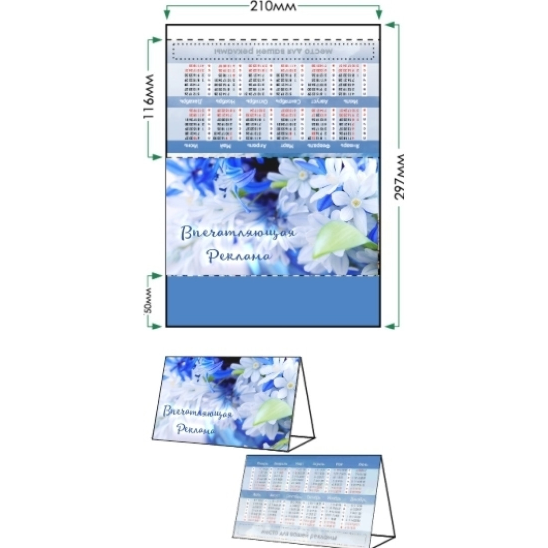 — это полноцветные настольные календари, имеющие каркас с треугольным сечением. Изготавливаются из картона, по линиям сгиба делается биговка. Донышко можно скреплять степлером или двухсторонним скотчем, либо при помощи вырубного замка.