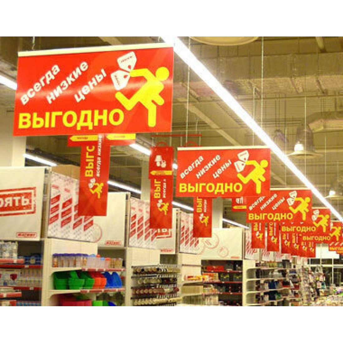 Мобайл — жесткий плакат, подвешенный к потолкус помощью лесок. Является не только рекламно-информационным POS-материалом, но и отличным элементом навигации для посетителей внутри торговых и выставочных центров, крытых рынков, стадионов, супермаркетов и мегамоллов.